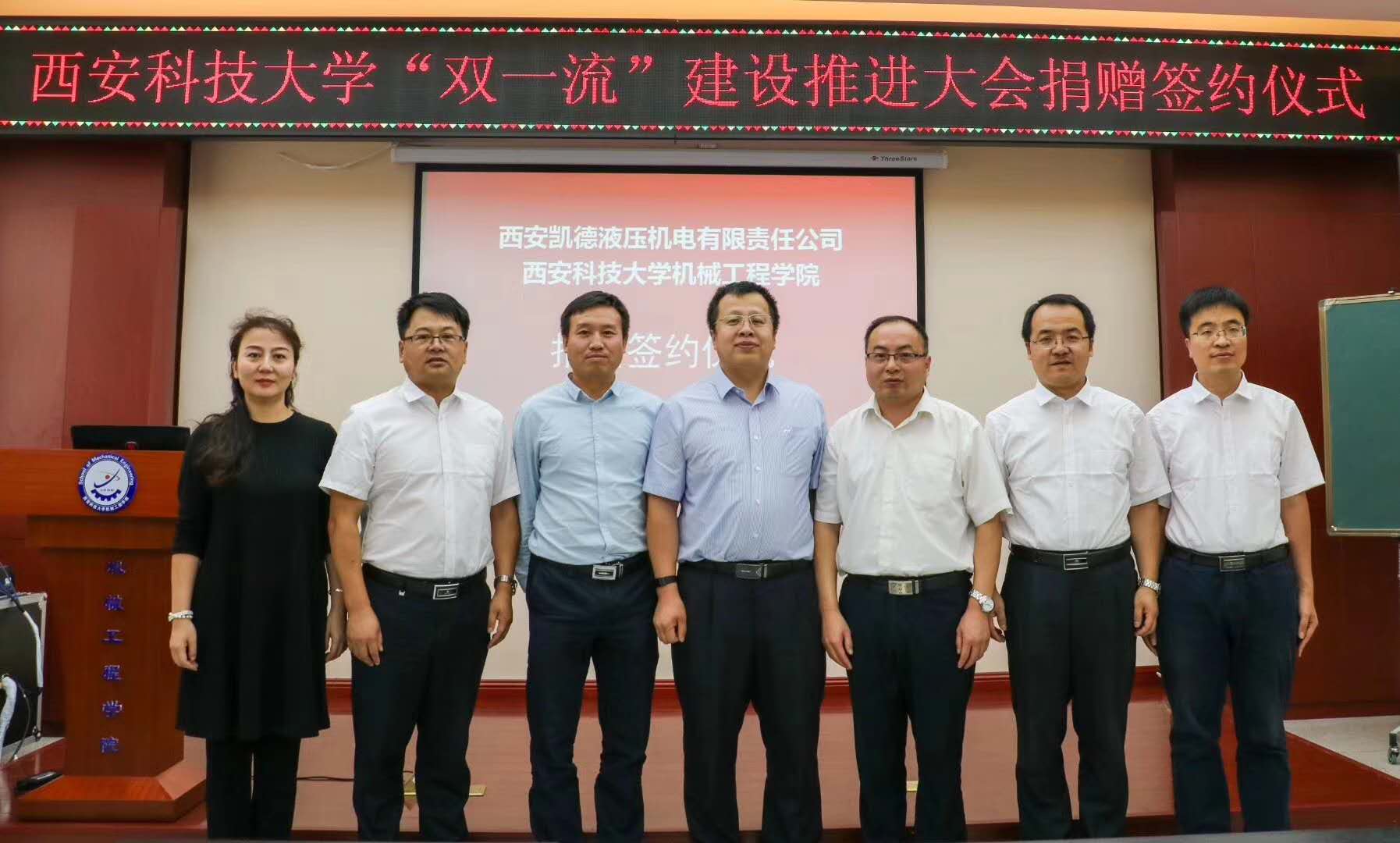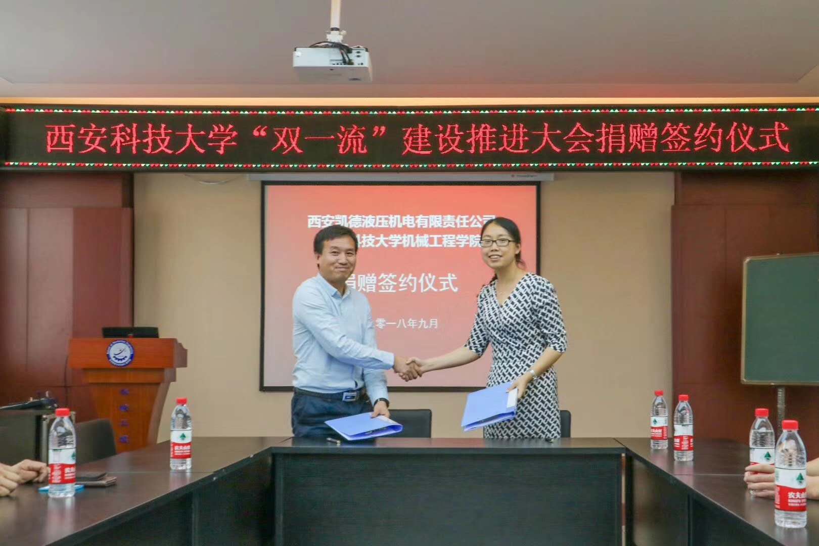 9月14日上午,為慶賀西安科技大學六十周年校慶,我公司總經理高彥軍、技術總監(jiān)胡松剛一行代表西安凱德液壓來到西安科技大學臨潼校區(qū)驪山校園,向機械工程學院捐贈了液壓馬達、液壓泵等液壓元件解剖件。機械工程學院黨委書記汪衛(wèi)兵,院長張旭輝,黨委副書記李婉麗,副院長趙栓峰,副院長寇發(fā)榮等相關負責人及部分學生參加了簽約儀式。