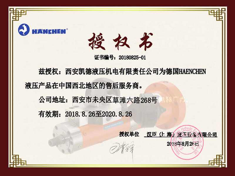 西安凱德液壓獲得德國漢臣(HAENCHEN)中國西北地區(qū)液壓產(chǎn)品售后服務(wù)商授權(quán)